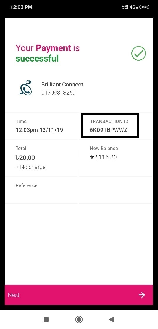 পেমেন্ট সম্পন্ন হলে বিকাশ অ্যাপ এর ওপরে বাম পাশে নোটিফিকেশন অপশন থেকে ট্রানজেক্শন আইডি পাবেন।