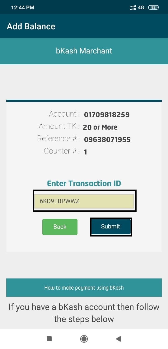 ট্রানজেক্শন আইডি বক্সে আগে পাওয়া ট্রানজেক্শন আইডিটি কোন স্পেস ছাড়া টাইপ করে Submit বাটনে ক্লিক করুন।