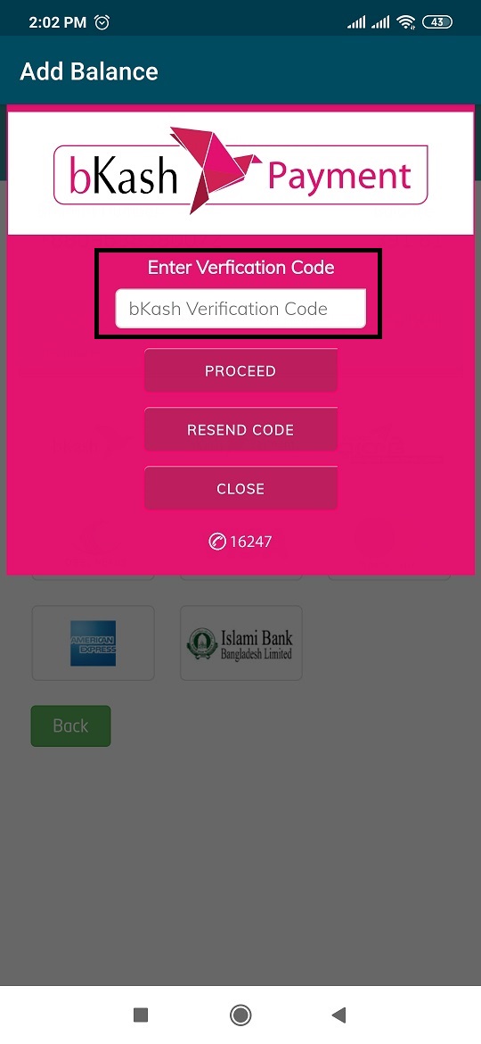 আপনার বিকাশ নম্বরে একটি SMS আসবে এবং সেখান থেকে bKash verification code লিখুন | Proceed অপশনটি সিলেক্ট করুন