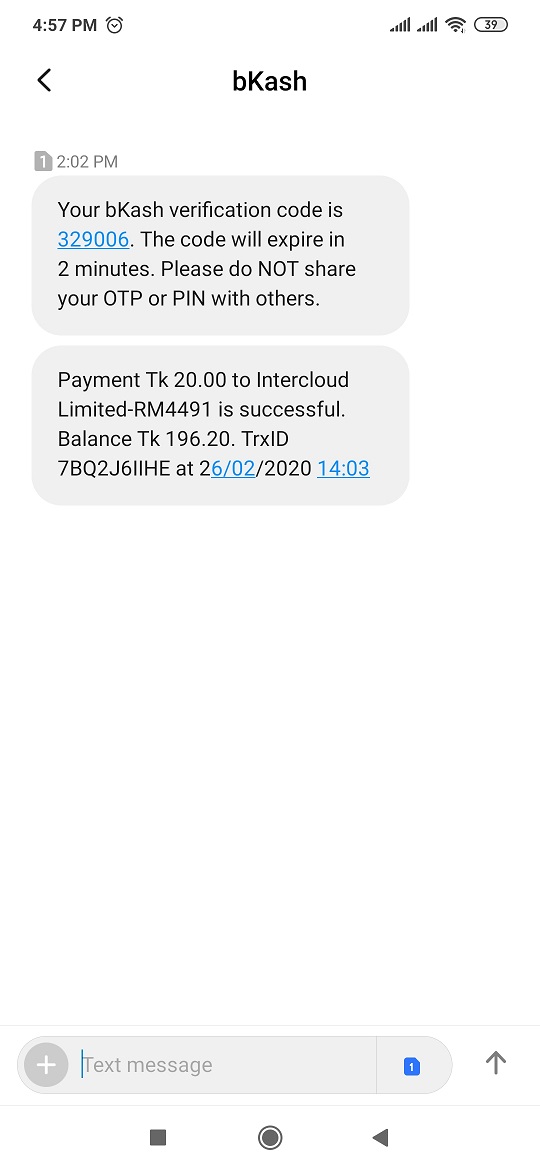 আপনার বিকাশ নম্বরে পেমেন্ট সম্পন্ন হওয়া একটি SMS পাবেন