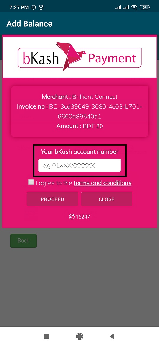 Your bKash account number বক্সে বিকাশ নম্বরটি লিখুন এবং Proceed অপশনটি সিলেক্ট করুন